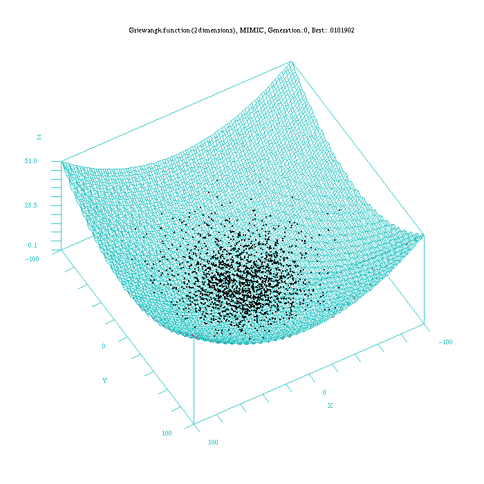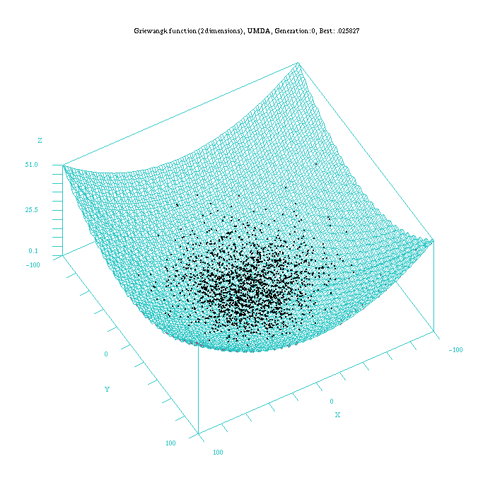 Table 1: Mean values of experimental results after 10 executions for the problem Griewangk with a dimension of 10 and 50 (optimum fitness value = 0). 4.3 The evolution of the searchAs an example to illustrate the difference in the way of reaching the final result for all the continuous EDAs, Figure 3, 4, 5, 6, and 7, show which is the behaviour of the UMDAc, MIMICc, Edge Exclusion, EMNA-global and EMNA-adaptative algorithms for the Griewangtk problem with a dimension of 2. Figure 3: Plot of the UMDAc approach for the Griewangk funtion. Function computed with scilab. Figure 4: Plot of the MIMICc approach for the Griewangk funtion. Function computed with scilab.
