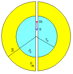 Vamos a estudiar un modelo de Tierra que consta de un núcleo de radio rc=3490 km y densidad constante ρc=11.0 g/cm3 y un manto de radio interior rc y radio exterior R=6371 km de densidad constante ρm=4.437 g/cm3. Naturalmente, ρc, ρm y la densidad media ρ=5.517 g/cm3 están relacionadas mediante la ecuación