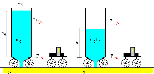 Supondremos que el depósito se mueve con velocidad inicial v0, en el instante inicial t=0, en el que se abre el orificio de salida de la arena.