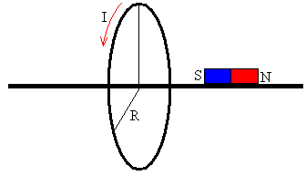 Oscilaciones armónicas del imánEn una primera aproximación, ignoraremos el efecto del tamaño finito del imán. Consideremos una bobina muy estrecha de N espiras del mismo radio R. El campo producido por dicha bobina en un punto P del eje de la bobina situado a una distancia x de su centro es