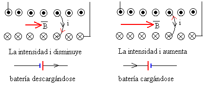 Cuando la intensidad de la corriente i cambia con el tiempo, se induce una f.e.m. en el propio circuito (flecha de color rojo) que se opone a los cambios de flujo, es decir de intensidad. Derivando respecto al tiempo la expresión del flujo propio