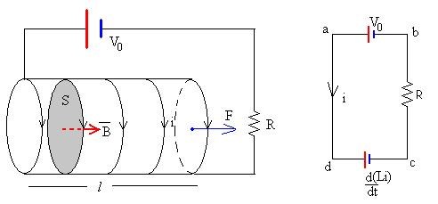 Cuando se conecta una batería V0 a una resistencia R y una autoinducción L, la corriente se incrementa, la autoinducción se comporta como una batería VL que se opone al incremento de la corriente, el circuito equivalente de la parte derecha de la figura.