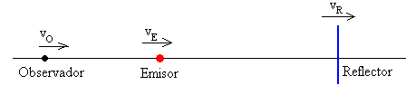 En esta página, estudiamos el efecto Doppler debido al sonido producido por un emisor que se mueve a lo largo de una línea recta con velocidad vE>0. El sonido choca con un reflector que se mueve en la misma dirección con velocidad vR. El observador que se mueve con velocidad vO mide la frecuencia f del sonido reflejado. Supondremos que las velocidades del emisor, observador y reflector son menores que las del sonido vS.