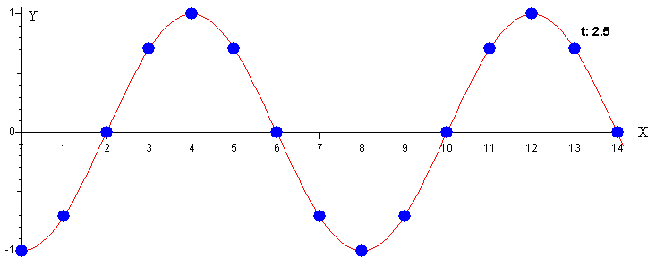 El número de onda k y por tanto, la longitud de onda λ=2π/k= Γd/t no es constante. Es infinita para t=0 (todas las partículas están en una línea recta) y decrece con el tiempo. El programa interactivo traza la función continua de x y t.