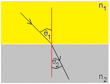 - Si n1>n2, el ángulo θ2 del rayo refractado es mayor que el incidente θ1. Para el angulo incidente crítico n1·sinθc=n2, el ángulo refractado es θ2=90°. Si el ángulo incidente θ1>θc, no hay rayo refractado, solamente reflejado θ2=θ1.