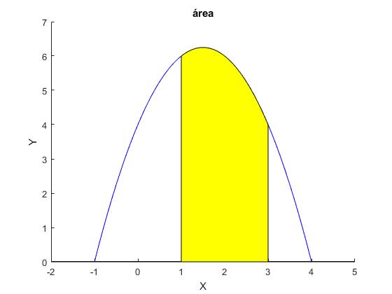 Dibujamos la función -x2+3x+4 y definimos la región comprendida entre la curva, el eje X y las rectas x=1 y x=3 que queremos colorear con el comando