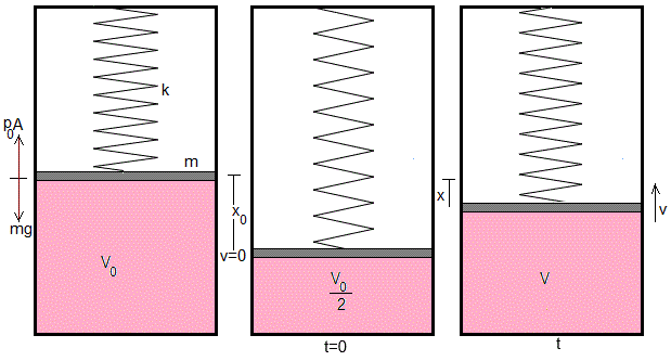 En la situación inicial, se comprime el gas hasta que su volumen es V0/2. Se suelta el émbolo con velocidad inicial v=0, nula.