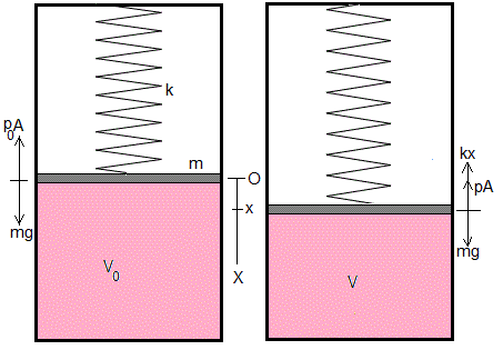 Un émbolo de masa m=10 kg y sección A=500 cm2 comprime el gas, dejando la parte superior del recipiente vacío. Un muelle elástico de constante k=mgA/V0 unido al émbolo está sujeto en la parte superior del recipiente.