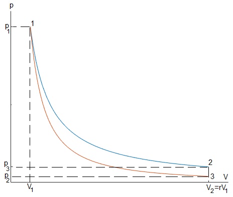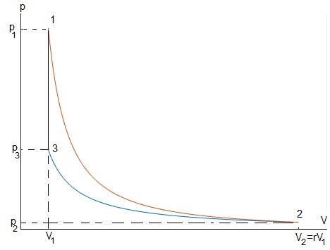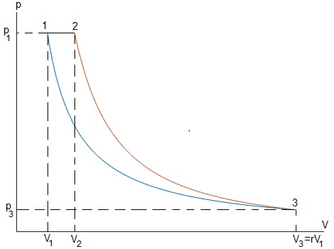 El volumen VB, se determina, igualando el trabajo en las expansiones isóbaras AB y CD con el trabajo para comprimir el gas isotérmicamente en el proceso DA. El trabajo neto es cero
