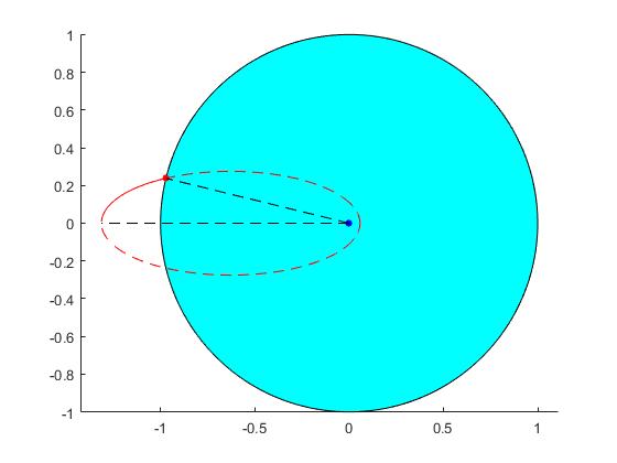 R=6371*1000; %radio de la Tierra M=5.972e24; %masa de la Tierra G=6.674e-11; %constante G h=2700*1000; %altura de disparo r0=R+h; %desde el centro de la Tierra hold on plot (-r0/R,0,'o','markersize',4,'markeredgecolor','r','markerfacecolor','r') ang=(1:360)*pi/180; fill(cos(ang),sin(ang),'c') %la Tierra plot (0,0,'o','markersize',4,'markeredgecolor','b','markerfacecolor','b') %trayectoria en el exterior v0=3.70*1000; %velocidad de disparo d=r0^2*v0^2/(G*M); e=sqrt(1+r0*v0^2*(r0*v0^2-2*G*M)/(G*M)^2); E=v0^2/2-G*M/r0; r=@(x) d./(1+e*cos(x)); %intersección th_0=acos((d-R)/(R*e)); plot (cos(th_0),sin(th_0),'o','markersize',4,'markeredgecolor', 'r','markerfacecolor','r') ang=(th_0*180/pi:180)*pi/180; plot(r(ang).*cos(ang)/R, r(ang).*sin(ang)/R,'r') %trayectoria en el interior Ep=E+3*G*M/(2*R); ep=sqrt(1-G*M*(r0*v0)^2/(R^3*Ep^2)); dp=(r0*v0)^2/Ep; phi_0=th_0-acos((dp-R^2)/(ep*R^2))/2; th_1=2*phi_0-th_0; ang=(th_1*180/pi:th_0*180/pi)*pi/180; r2=@(x) dp./(1+ep*cos(2*(x-phi_0))); plot(sqrt(r2(ang)).*cos(ang)/R, sqrt(r2(ang)).*sin(ang)/R,'k') ang=(th_0*180/pi:360+th_1*180/pi)*pi/180; plot (cos(th_1),sin(th_1),'o','markersize',4,'markeredgecolor', 'r','markerfacecolor','r') hold off axis equal