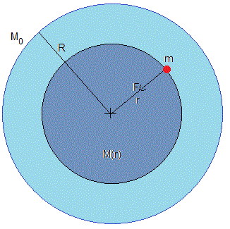 Sea una estrella de masa M0 y radio R. Una hipotética partícula de masa m se mueve por su interior. La fuerza sobre la partícula cuando se encuentra a una distancia r de su centro es