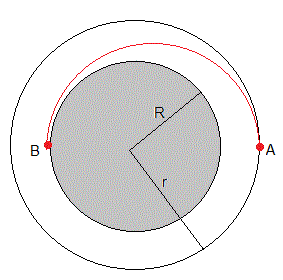 Una nave espacial de masa m=12000 kg, describe una órbita circular alrededor de la Luna a h=100 km de altura sobre su superficie. Para aterrizar en el punto B de la superficie de la Luna, activa su motor de frenado en A durante un intervalo pequeño de tiempo disminuyendo su velocidad. La nave espacial describe una órbita elíptica, cuyo foco se encuentra en el centro de la Luna, que conecta los puntos A y B. Calcular