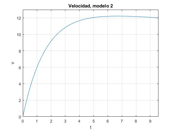 La velocidad crece rápidamente, se mantiene casi constante y luego disminuye ligeramente hacia el final del recorrido. La velocidad final en el instante t=9.58 s es v=12.01 m/s, un poco más pequeña que la predicha por el modelo anterior.