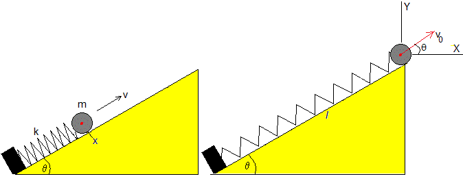 Si despreciemos el rozamiento, aplicamos el principio de conservación de la energía para calcular la velocidad final v0 de la bola. La energía potencial elástica almacenada en el muelle, se convierte en energía potencial correspondiente a la altura lsinθ y en energía cinética