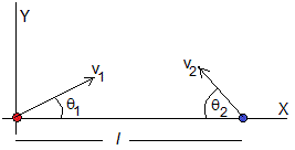 - El segundo vehículo parte de la posición P(l,0) con velocidad constante v2 haciendo un ángulo θ2 con la línea PO, tal como se muestra en la figura