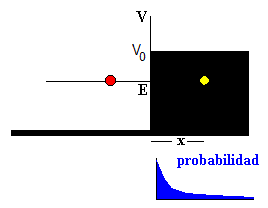 En la figura se muestra la probabilidad de encontrar una partícula de energía E<V0, a una distancia x del origen en el interior de la región prohibida desde el punto de vista de la Mecánica Clásica. Como vimos en el estudio del escalón de potencial, la probabilidad por unidad de longitud viene dada por una función exponencial decreciente.