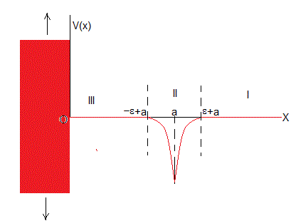 Representamos el potencial delta de Dirac por la función que se muestra en la figura, un pozo centrado en a de anchura 2ε y profundidad que tiende a infinito, siendo ε→0.