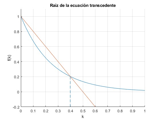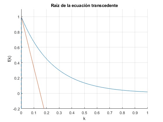 Una raíz es k=0. La raíz buscada, si existe, se obtiene resolviendo la ecuación transcendente utilizando la función