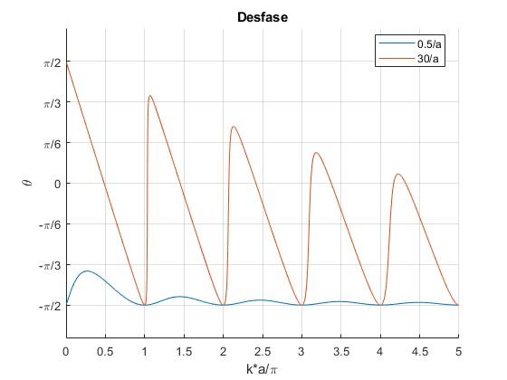 Representamos el ángulo de desfase θ en función de ka/π manteniendo fijo a=2 y para dos valores del parámetro α, 0.5/a y 30/a