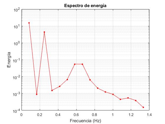 Representamos la energía en función de la frecuencia en escala logarítmica en el eje Y.Con Data Cursor vemos las frecuencias que contribuyen más a la energía: f1=0.0833 Hz, f3=0.25 Hz, f7=0.583 Hz y f8=0.667 Hz. Estas dos últimas comparten la misma energía y posiblemente, la depositaria sea una única frecuencia intermedia entre las dos que no ha sido detectada por el análisis que hemos hecho basado en una frecuencia fundamental f1=1/12 Hz y múltiplos enteros de dicha frecuencia.