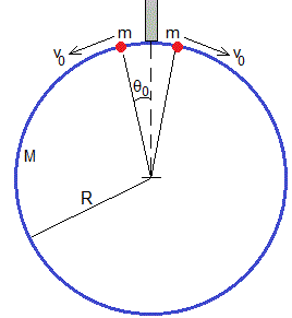 Un anillo de masa M y radio R permanece en posición vertical. Dos partículas iguales de masa m pueden deslizar sin rozamiento a lo largo del anillo, partiendo desde la posición inicial θ0 con velocidad v0.