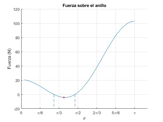 Supondremos que el anillo cuelga de una balanza. Vamos a calcular la fuerza T que mide en función de la posición angular θ de las partículas