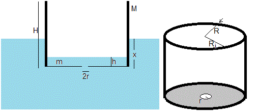 Sea un recipiente de forma cilíndrica abierto por arriba de masa M y altura H. Las paredes del recipiente tienen un espesor no nulo de modo que su radio interior es Ri y su radio exterior es R, en el fondo hay un pequeño agujero de radio r. Se coloca sobre la superficie del agua, que entra por el agujero con velocidad v