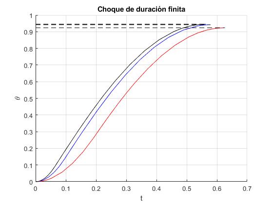 - La desviación máxima que alcanza después del choque es θm=54.3º, un valor similar al calculado empleando la aproximación de choque instantáneo.