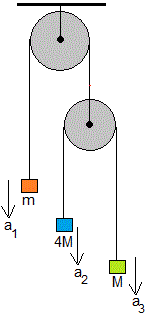 Sea m1=m, m2=4M y m3=M. Las aceleraciones a1, a2 y a3 valen
