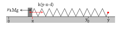 Cuando el operario se mueve hacia la derecha una distancia y del origen, el muelle se estira y la caja permanece en reposo en x=0. La fuerza de rozamiento Fr es igual a la fuerza que ejerce el muelle deformado k(y-d). En el momento en el que la fuerza de rozamiento alcanza su valor máximo μsMg, la caja empieza a deslizar.
