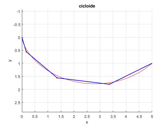 El tiempo que emplea la partícula en recorrer el arco de cicloide es 1.388 y el camino formado por los tres planos inclinados, 1.408 más próximo que con tres rampas. Comprobamos que los tiempos t1, t2, t3 y t4 son casi idénticos. Las coordendas de los puntos de unión son (x1, y1)=(0.1663, 0.5577), (x2, y2)=(1.3547, 1.5616), (x3, y3)=(3.3612, 1.8073)