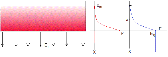 Supongamos que la densidad de carga ρ(x) disminuye rápidamente desde la superficie de la placa hacia su interior de la forma que indica la curva del color rojo, o el gradiente de color rojo con el que se ha pintado la placa