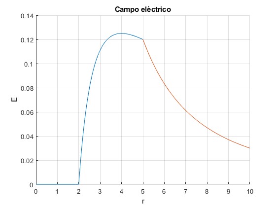 Representamos el módulo del campo eléctrico E en función de la distancia radial r. El área sombreada es la diferencia de potencial