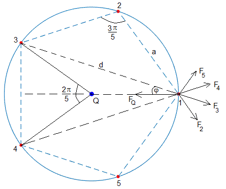 En el triángulo formado por las cargas 1, 2 y 3, la distancia entre las cargas 3 y 1 es d=2asin(3π/10)=4Rsin(π/5)sin(3π/10). El módulo de la fuerza vale