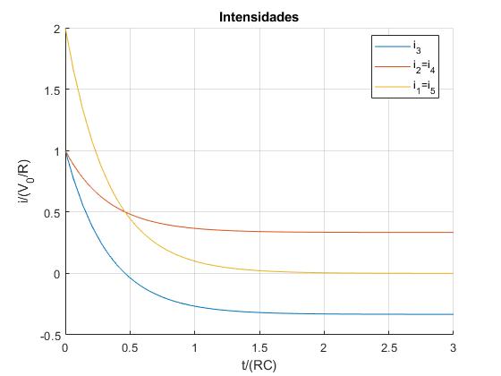 Representamos las intensidades en unidades V0/R en función del tiempo adimensional t/(RC)