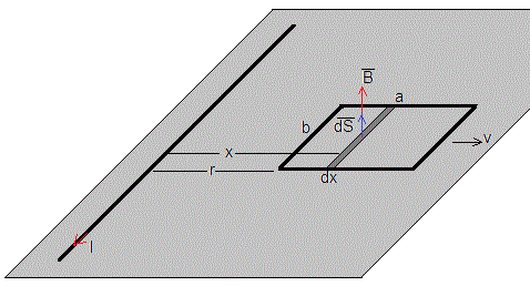 Consideremos una corriente rectilínea muy larga por la que circula una corriente I(t) en el sentido indicado, que dista r de una espira rectangular de lados a y b hecha con un cable de resistencia R.