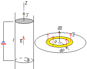 Por una porción de conductor de longitud l, sección de radio a, por el que circula una corriente de intensidad i, la ley de Ohm se escribe