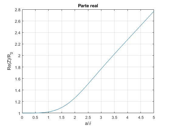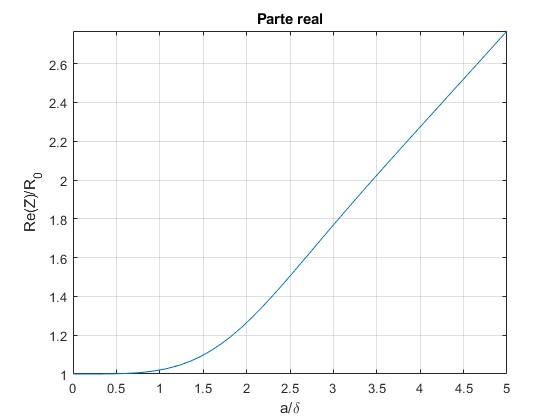 Representamos la resistencia R por unidad de longitud, la parte real de Z/R0 en función de a/δ