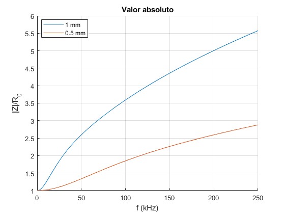 Representamos |Z(ω)| en función de la frecuencia f para dos valores del radio a, 1 mm y 0.5 mm