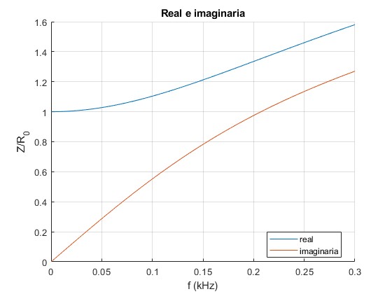 Representamos la parte real e imaginaria de la impedancia Z(ω) de un cable de cobre de radio a=1 cm en función de la frecuencia f en el intervalos [0, 0.3] kHz