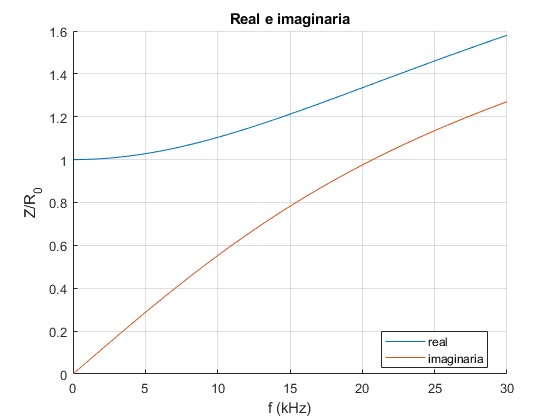 Representamos la parte real e imaginaria de la impedancia Z(ω) de un cable de cobre de radio a=1 mm en función de la frecuencia f en el intervalos [0, 30] kHz
