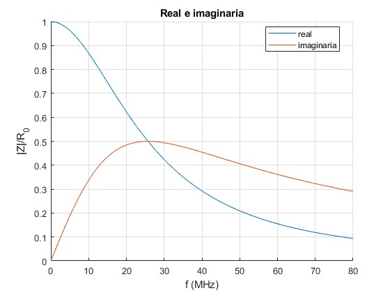 Representamos la parte real e imaginaria de la impedancia Z(ω) de un cable de radio a=1 cm, hecho de un material de conductividad σ=0.1 Ω-1·m-1, permitividad eléctrica relativa εr=70, en función de la frecuencia f en el intervalos [0, 80] MHz