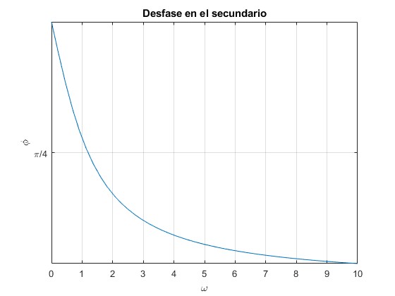 Representamos la fase de la intensidad en el secundario, φ en función de la frecuencia angular ω de la fuente alterna conectada al primario