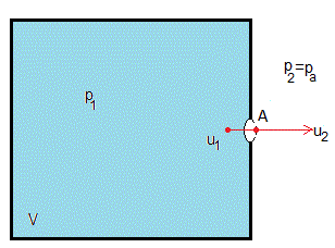Supondremos un recipiente de volumen V que tiene un pequeño agujero de sección A. Su presión inicial es p0. Al cabo de un cierto tiempo tf la presión del recipiente se iguala a la presión atmosférica pa