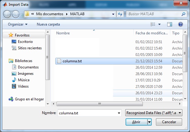 En el cuadro de diálogo que aparece, seleccionamos en Output Type, la opción Column vectors. Pulsamos el botón Import data