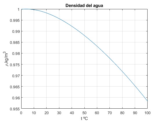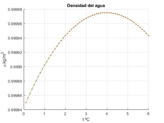 Representamos la densidad del agua en kg/m3 en función de la temperatura en °C. Los datos están contenidos en el fichero de texto densidad_agua.txt que se descarga a la carpeta de trabajo de MATLAB