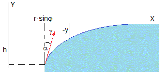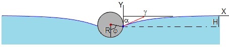 Una flecha de color rojo, señala la dirección de la fuerza que ejerce la tensión superficial, tangente a la superficie del líquido en los puntos de contacto (Rsinφ, -H) con el cilindro (en color azul). El ángulo α es el que hace la tangente con la vertical.