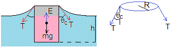 Sea un objeto de masa m parcialmente sumergido en un líquido de densidad ρf. La superficie del fluido se deforma estableciéndose una línea de contacto entre el cuerpo y el líquido a una profundidad h por debajo de la superficie libre sin deformar. La recta tangente a la superficie del fluido en los puntos de contacto hace un ángulo α con la vertical