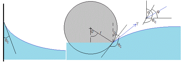 A la derecha de la figura, se traza la tangente a la superficie del sólido parcialmente sumergido en el punto de contacto (sólido-líquido). Se traza la tangente a la superficie del líquido en dicho punto (hace un ángulo α con la vertical). El ángulo de contacto θc entre las dos rectas se muestra en la figura