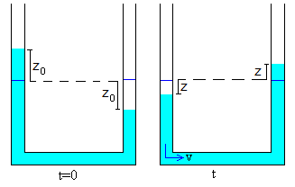 Para conseguir un desnivel inicial entre los brazos verticales del tubo, se pone un corcho en el extremo de un brazo, se extrae algo de aire, el líquido en este brazo se eleva z0 y desciende la misma longitud en el otro brazo. Se descorcha el tubo y se empieza a contar el tiempo, en el instante inicial t=0, tenemos z=z0 y v=0.